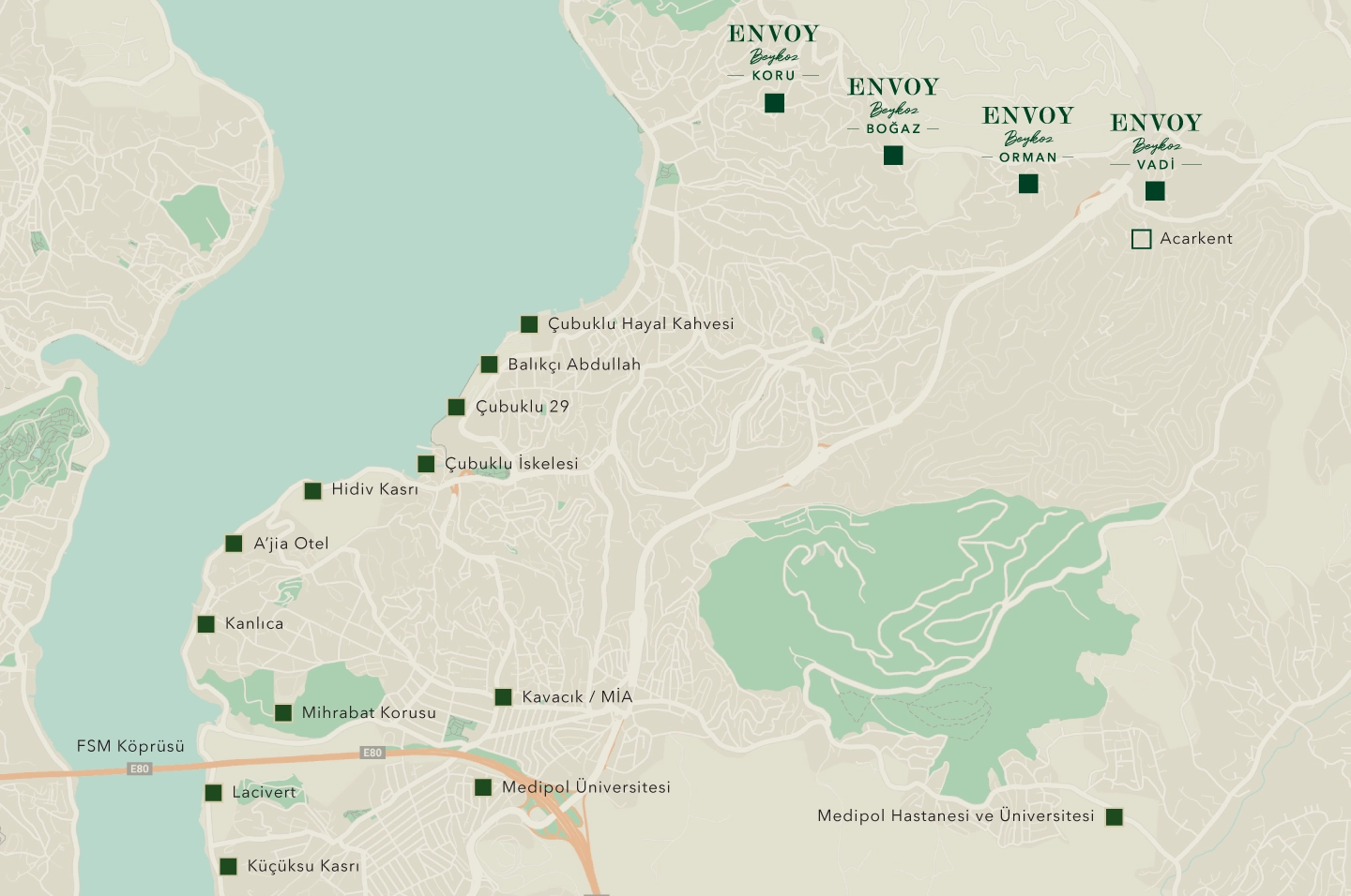 Şehrin içinde, doğanın kalbinde, Boğaz ve orman manzarası eşliğinde Avrupa Yakası’na ve şehrin merkezi noktalarına ister karadan ister denizden, kolay ulaşım imkanının konforunu Envoy Beykoz Vadi projesinde bulacaksınız.